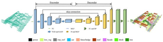 Due to the fact that encoder–decoder architecture can capture hierarchical semantic information, it has been successful in many 2D image semantic segmentation tasks. Many prevalent networks [,] also employ it for 3D point cloud semantic segmentation. The architecture needs appropriate methods for downsampling and feature extraction. Farthest point sampling (FPS) is widely used as a downsampling method, but it has a high time complexity of (N2). This implies that the method is not suitable for point cloud datasets with a large number of points []. The graph neural networks for point cloud classification can efficiently capture the local structure information of point clouds, but the receptive field size of many graph neural networks is usually not sufficient to capture comprehensive contextual information.