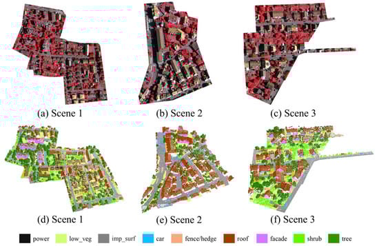 Three scenes of the experimental dataset. Scene 1 is used as the training set, and Scene 2 and Scene 3 are used as the test set. (a–c) are orthoimages; (d–f) are ALS point clouds.