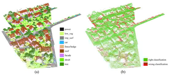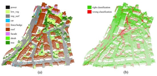 From Table 3, we can see that our method can correctly classify most of the test points. We achieved satisfactory classification results (F1 score higher than 75%) for five categories, namely, low vegetation, impervious surfaces, roof, car, and tree, most of which are large objects. For example, the precision, recall, and F1 score for the roof category are 93.9, 94.2, and 94.1%, respectively. Our method has poor classification results for the shrub and fence/hedge categories, which may be due to their similarity of low-level features, including height and geometric distribution features. In addition, some shrub points were wrongly labelled as trees and low vegetation, which may be due to the lack of clear boundaries between shrubs and the two categories.