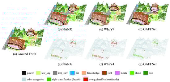 As can be seen from Table 4, compared with other methods, our method well balances OA and the macro avg F1 score, and achieves the highest performance in terms of the macro avg F1 score. In addition, our method displays the best performance in terms of F1 scores for some categories. It is worth mentioning that our method achieves a significantly high classification performance for the facade category. To illustrate this intuitively, we plotted the classification results of three different methods in Figure 10, namely, NANJ2, WhuY4, and GAFFNet, which demonstrate the top three performances shown in Table 4. Facade points are easily covered and misclassified. As shown in Figure 10, the NANJ2 and WhuY4 methods misclassify many facade points into the roof category or other categories, and our method has a much larger number of correctly classified points (green) than that of the other two methods. This is most likely because the NANJ2 and WhuY4 methods lose the 3D spatial information when converting the point cloud into 2D images.