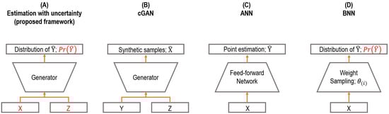 Comparison to related works. (A) cGAN as a prediction model (the proposed framework); (B) ordinary cGAN for sample generation; (C) artificial neural networks for prediction; (D) Bayesian neural networks.