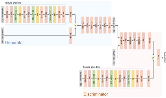 GANs are probabilistic neural network models in common with BNNs; however, in contrast to BNNs, GANs use deterministic weight parameters, and, instead, employ a stochastic noise vector as their input for representing latent features in a dataset [33,34,35,36,37]. The training of GANs is performed in an adversarial manner in which a discriminator and a generator play a game to distinguish and deceive each other. Generally, GANs are used to learn sample distributions; therefore, by varying the noise vector with the Monte Carlo method, the output of the generator is a synthetic sample: