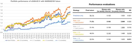 When only the predictions of returns are given, the simplest strategy that uses the predictions is taking a long position if the prediction is positive and taking a short position when it is otherwise. The portfolio performance of the simplest strategy using only the prediction results of cGAN-UC is represented with dark blue in Figure 3. We can further enhance the performance by using the estimated uncertainty (risk), along with the predictions. The other strategies employ the uncertainty by introducing a neutral position if the uncertainty is above certain thresholds; such an approach signifies that we do not take a risk for uncertain predictions. The orange strategy in the figure considers predictions with >2.0 uncertainty as invalid predictions; thus, we take neutral position in such cases. By using the strategy, the final return increases by 17.1% points, and the standard deviation of the portfolio simultaneously decreases, compared to the conventional strategy. Furthermore, interestingly, the standard deviation of the strategy with <1.7 uncertainty (gray) considerably decreases while the final returns of the strategies are similar to that of conventional strategy. Such a possibility of performance enhancement is another strong evidence that the estimated uncertainty is effective.