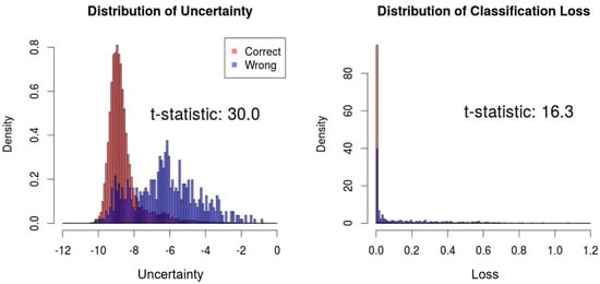 We compare the distributions of the proposed uncertainty measure and the conventional uncertainty measure with respect to correct and wrong predictions. Then, the t-test is performed to measure the difference between the two distributions, which can indicate the correlation between the estimated uncertainty and actual prediction results. As a result, the t-statistics of the proposed uncertainty measure and the classification loss are 30.0 and 16.3, respectively, which signifies superior performance to estimate the uncertainty of predictions (Figure 4).