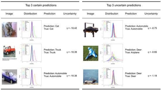 In this section, the proposed framework is applied to an image classification task with the CIFAR-10 dataset. The CIFAR-10 dataset consists of dimensional images, which contain 50,000 training samples and 10,000 test samples in 10 different categories. Unlike regression tasks, for classification tasks, deterministic models can estimate the uncertainty of predictions by using the probability of point estimates as the certainty of predictions since a softmax function is used for the last layer of the network in general. For instance, if a prediction of a deterministic model is ‘Car’ with a 98% probability, the uncertainty can be estimated by 2%. In this manner, for the uncertainty measure of deterministic models, the log of the probability of point estimates, i.e., the cross-entropy classification loss, is employed as a conventional method.
