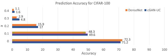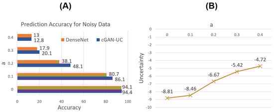 Figure 6A shows the prediction results for the noisy data. As expected, for not only the original image data but also the noisy data, it is demonstrated that cGAN-UC outperforms the ordinary DenseNet; moreover, the performance difference is more significant in the noisy data. Specifically, with , the performance difference is 10.0% point where the accuracy of cGAN-UC and DenseNet is 48.1% and 38.1%, respectively.