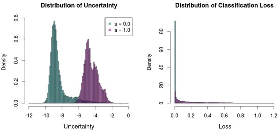 Distributions of the uncertainty and the classification loss with the test set () and noises ().