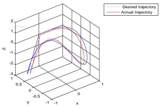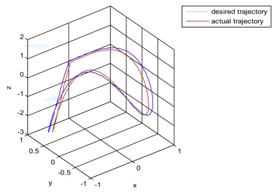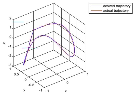 Figure 14. The red line represents actual trajectory, and the blue line represents desired trajectory. The maximum error of trajectory tracking in three directions are 0.02, 0.01, and 0.015, respectively. The trajectory tracking performance of the asymmetric teleoperation system is improved.