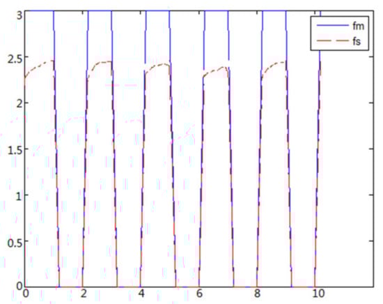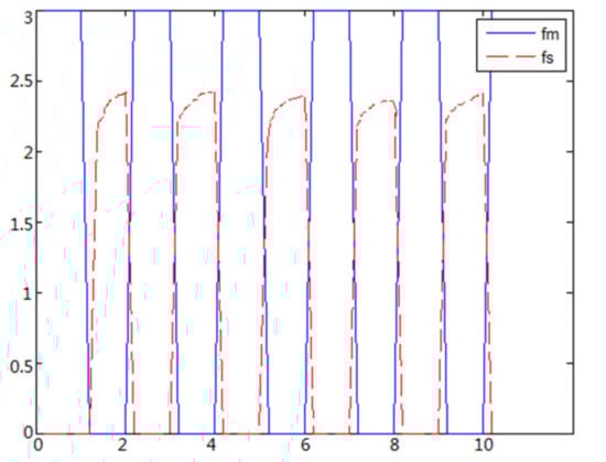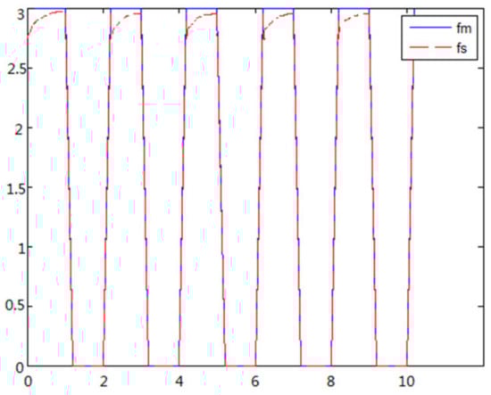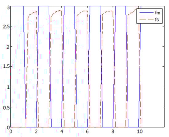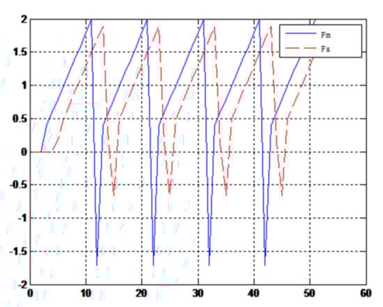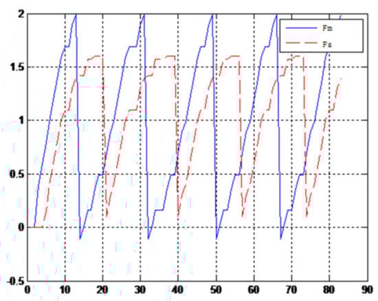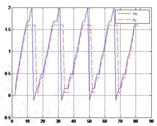 Figure 14 shows the force feedback wave along the x axis of the master robot when grasping a solid object (constant time delay). The force feedback wave fs follows fm after a constant time delay; the equipment of the asymmetric teleoperation system are installed in the same room. Theoretically, there is no time-delay, and the time-delay can be ignored.