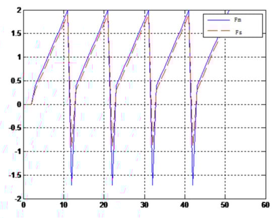 Figure 13 shows the force feedback wave along the x axis of the master robot when grasping a solid object (no time delay). The force feedback wave fs is related to fm;