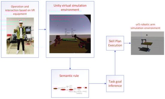 In the research of this article, we propose a framework for inferring the semantics of activities based on virtual reality demonstrations. This framework includes three main modules: (1) Assembly task demonstration based on virtual reality helmet and unity physics engine. (2) Semantic activity decomposition of the demonstration task. (3) Semantic activity sequences of perception are performed by the robotic arm. Figure 1 describes our framework and the relationship between these frameworks.