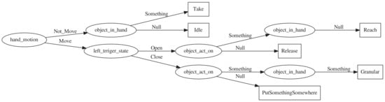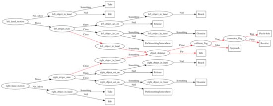 The decision tree generated in this study is shown in Figure 3. It consists of two steps: the first step is to generate a tree, which can determine the basic human hand activities in a general form (that is, reach, take, putsomethingsomewhere, release and idle). The second method extends the tree obtained by the tree to identify more complex two-hand assembly activities. We refer to these types of activities as granular activities, such as approach, revolve and pin-in-hole, as shown in Figure 4.