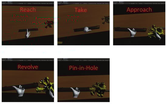How to turn the tasks demonstrated by humans into information that robots can understand is a complex problem. In the virtual demonstration environment, the motion data of the demonstrator can be directly obtained. We need to process these motion data to obtain meaningful activity semantic information. We refer to the method proposed by Ramirez-Amaro [] and make improvements and enhancements on this basis. Ramirez-Amaro’s method is to extract spatio-temporal features from video data and then perform staged action recognition. In addition, Ramirez-Amaro’s method is aimed at human activities in daily life, and it is difficult to analyse complex industrial assembly operations.