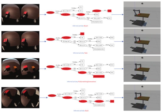 Similar to the previous example, Figure 8 depicts more activities inferred and performed by UR5 in real-time. For example, the second row of Figure 8 shows the activity of grabbing an object, and the third row shows the activity of placing something somewhere. The last line shows the stacking activity; note that this represents a new activity of the system in this case. This means that the activity is learned on demand. Please note that all implemented applications and modules in our system are running during execution.
