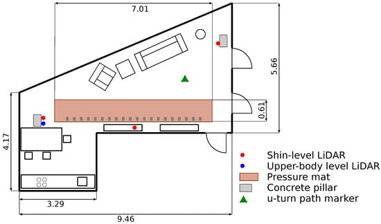 LiDAR system: Four LiDARs (UST-10LX-H01 and UST-20LX-H01, Hokuyo, Japan) were installed in the living room (see Figure 1) of the Neurotec Loft.