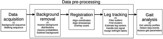 Data processing workflow. LiDAR data were first acquired (1), then the background data points were removed (2). Next, data from all sensors were aligned and overlaid using spatial as well as time registration (3). Then, clustering algorithms were applied to identify body clusters which were tracked across data frames (4). Finally, gait analysis was performed (5).