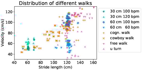 In our measurements, through a free walk at a self-selected speed, as well as walks at a predefined speed, eight different walks were performed by every participant. These covered a wide range of different gait clusters, as shown in Figure 4. The walks with a predefined speed or step width formed tighter clusters of points, whereas the walks at self selected speed spread over a larger range of values. The walking velocities ranged from 40 cm/s up to 130 cm/s, while the stride lengths ranged from 50 cm up to around 160 cm.