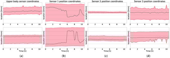Long-term location for every LiDAR sensor split for x- and y-direction. In (a), data from upper body sensor is shown, its location is denoted with blue marker in Figure 1. In (b–d), data from the leg tracking sensor are shown. Their location is marked in Figure 1 with red markers. Top row shows x-position of upper body and legs, bottom row shows y-position of upper body and legs. The black line indicates the median value, the red-shaded area is the 2nd and 3rd quartile. The y-axis is scaled to 2.5 cm, with every tick indicating 5 mm. No absolute position units are given.