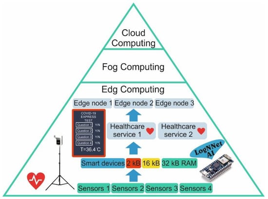 Intelligent devices with limited resources [13], such as devices with a small amount of RAM (2–32 kB), a weak processor, and small dimensions, can receive various information about a patient’s condition from different sensors. These sensors can be wearable sensors, which can measure heart rate, blood pressure, body temperature, and glucose levels, and external sensors are installed at control points. In addition, diagnostic information can be obtained as registered symptoms via mobile questionnaires, mobile devices, or public touch panels. In edge computing, the information that is received is pre-processed by artificial intelligence (AI) on the peripheral device, generating local healthcare services. Local data processing improves the confidentiality, security, and reliability of systems operating on the edge architecture [8].
