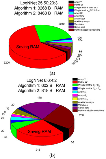 The LogNNet 25:50:20:3 model for assessing perinatal risk uses about 8 kB of RAM, and a more detailed RAM distribution is shown in Figure 6a. A significant part of the memory, ~5 kB, is occupied by the matrix W. When using Algorithm 1, this memory can be freed, and the algorithm will use only about 3 kB. The second biggest memory consumer (2 kB) is the array of weights between the Sh/Sh2 layers, as it contains the weights obtained after training the neural network. This neural network can be implemented on microcontrollers with 16–32 kB of memory, for example, Arduino Nano.