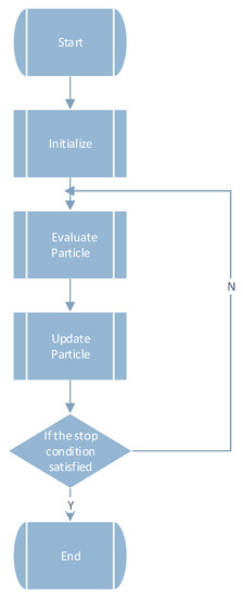 The particle swarm optimization algorithm has been widely used in various fields and has many efficient variations. Jun Sun et al. [19] proposed the quantum particle swarm optimization algorithm, which combines the PSO algorithm with quantum behavior to solve the traditional problems of the PSO algorithm. Lifeng Xu et al. [20] proposed a hybrid particle swarm optimization algorithm with multi-level disturbance to prevent the PSO algorithm from falling into local optima. Liu K. et al. [21] proposed a Bayesian network structure optimization method based on local information, by adding the PSO algorithm. Lingxia Liao et al. [22] aimed to solve a generic controller placement problem (GCP) by planning the placement of controllers over SDN systems; to achieve this, they proposed a novel multi-objective genetic algorithm (MOGA) with a mutation based on a variant of the PSO algorithm. Muhammad Salman Qamar et al. [23] aimed to settle the traveling salesman problem (TSP) by proposing a novel best–worst ant system (BWAS) based on the PSO algorithm. Xianjia Wang et al. [24] investigated the role of the particle swarm optimization (PSO) strategy update rules in the evolution of cooperation in the prisoner’s dilemma (PD) on scale-free networks. The flow chart of the particle swarm optimization algorithm is shown in Figure 1.