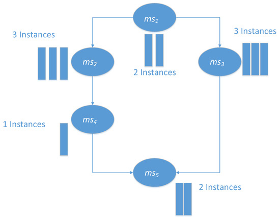 A simple application is shown in Figure 2. This graph shows a directed acyclic graph (DAG) of Job-A. There are five different microservices, corresponding to the five different microservices in the graph. In the execution process, microservice1, microservice2, microservice3, microservice4, and microservice5 have 2, 3, 3, 1, and 2 instances, respectively. The execution of microservice2 and microservice3 depends on the completion of microservice1, while the execution of microservice5 depends on the completion of microservice4 and microservice3 [32].