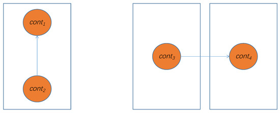 where refers to the number of requests that may fail when transmitting between containers in the same physical node, and refers to the number of requests that may fail when transmitting between containers in different physical nodes. Requests sent between containers within the same physical node are only affected by container failure rates; however, sending requests between containers of different physical nodes is affected not only by the failure rate of the container itself, as represented by and , but also by the failure rate of the physical node, . As shown in Figure 3, and are assigned to same physical node, such that the fail rate only depends on the containers; however, and need to transfer data from physical node to physical node, so the fail rate not only depends on the containers, but also on the physical nodes. The model in this paper calculates the number of failure requests that may occur in the container transmission within the same node and between different nodes to solve this problem—the model can even reasonably calculate and compare when there are multiple containers and multiple physical nodes.