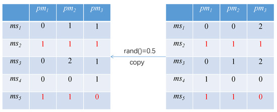 In the figure, the left side is the particle, and the right side is the individual extremum of the particle. According to the learning factor, the probability of a copy operation occurring is 0.5. The copy operation occurs at , and the particle copies the elements of the same row in , covering their own elements to achieve the purpose of learning from the individual extremum.