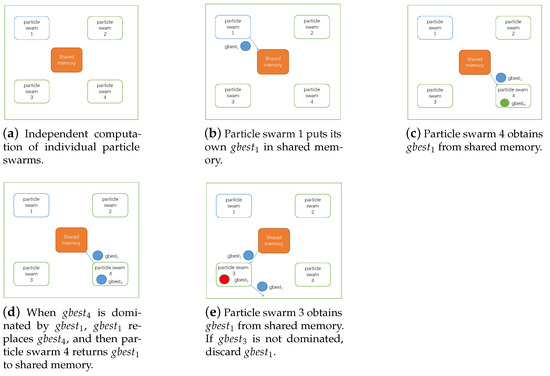 Traditional particle swarm optimization easily converges to local optima during the optimization process [33]. We use a parallel particle swarm optimization algorithm, in order to address this problem. Based on the traditional PSO algorithm, MOPPSO-CMS increases the number of simultaneous iterative particle swarms and allows the particle swarms to communicate with each other through inter-process communication, exchanging the optimal solution to avoid falling into local optima.