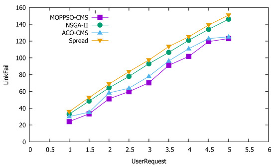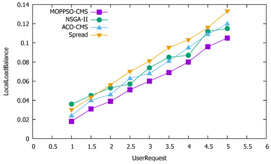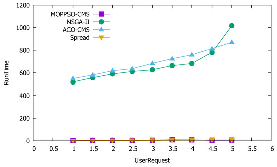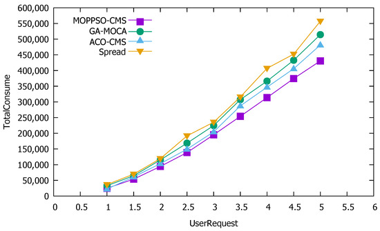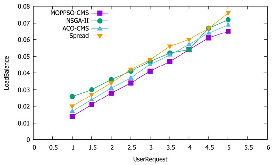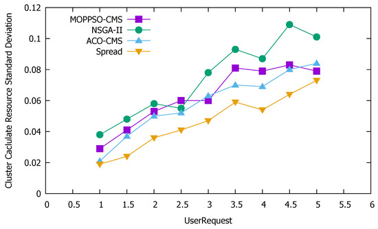 Figure 10 shows that the Spread algorithm achieved reasonable performance under low user requests; however, when the amount of user requests increased, the performance worsened. This is because the algorithm tried to divide each container to each physical node and, when there are few user requests, each physical node is allocated less containers, which does not result in reduced performance, as the resources are not overwhelmed. Both the ACO-CMS algorithm and the GA-MOCA algorithm fluctuated, and their performance was not stable. This may be because both algorithms optimize the load balancing of the cluster, but ignore local load balancing. The MOPPSO-CMS algorithm had the best effect, as it was specially designed to optimize the local load balancing, such that the resources on the physical nodes can be balanced and reasonably used in the calculation process.