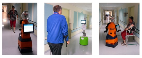 - Gross, H.M.; Meyer, S.; Scheidig, A.; Eisenbach, M.; Mueller, S.; Trinh, T.Q.; Wengefeld, T.; Bley, A.; Martin, C.; Fricke, C. Mobile Robot Companion for Walking Training of Stroke Patients in Clinical Post-stroke Rehabilitation. In Proceedings of the 2017 IEEE International Conference on Robotics and Automation (ICRA), Singapore, 29 May–3 June 2017; pp. 1028–1035. [Google Scholar]