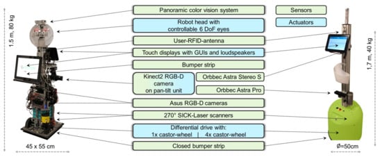 The base of the research platform is a customized SCITOS G3, and the base of the product prototype platform a TORY, both developed by MetraLabs GmbH (www.metralabs.com/en, accessed on 13 September 2021). Both robots have a similar height of 1.5–1.7 m, a footprint of  m,  m as the diameter, and can reach a speed of up to 0.9 .