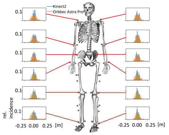 Accuracy studies in the gait laboratory should show whether the Orbbec Astra Pro has similar accuracy to the Kinect2, whose accuracy has already been shown to be sufficient in our preliminary studies (see also []) compared to the Vicon reference system (a static marker-based motion capture system). For this, Kinect2 and Orbbec Astra Pro were simultaneously attached to the robot, and the 3D skeleton points obtained by them were compared regarding the accuracy of these from the Orbbec Astra Pro to those of the Kinect2 and the Vicon system. While the standard deviations of the errors for the joint positions of the lower body estimated with the Kinect2 were between 3 and 5 cm, they were slightly higher with the Orbbec Astra Pro (see Figure 3). Despite the slightly higher error values for the Orbbec Astra Pro sensor, it was used for deployment on the product-related platform.