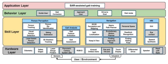 To manage the complexity of the application for the SAR-assisted gait training, a hierarchically organized software system with multiple abstraction layers was used (see Figure 4). As described for the research platform in [,], here, for both platforms, the robotic middleware MIRA [] was utilized, allowing decomposing the application into modules, which can be developed and tested independently.