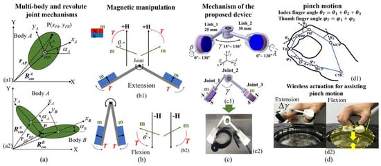 Figure 1 shows our proposed strategy for supporting pinch motions using magnetic actuation with manipulation. We considered the basic concepts of the parallel two-link mechanism comprising permanent magnets. Links 1 and 2 must move in opposite directions because the pinch motion moves the thumb and index finger in opposite directions. The links are parallel structures and produce independent movements. Thus, each link can be analyzed as a one-link manipulator. To produce movements in opposite directions between the two links in the applied magnetic field, we mounted permanent magnets on the links, and the directions of the magnetic moments (m) are the same (parallel) as those of movement, as shown in Figure 1b. The role of links 1 and 2 is to maintain a stable pinching motion. Note that if only the magnets are attached to the fingertips without the links, the magnets may stick together in the final pinch motion, causing difficulty separating the fingers for the next repetition. The proposed device uses multibody and revolute joint mechanisms. The position of joint P on body A relative to the global coordinate system is expressed as follows:
