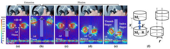where T is the magnetic torque, m is the magnetic moment of the permanent magnet, H is the magnetic field strength, is the vacuum permeability, and is the angle between the applied field and the magnetic moment direction. Figure 1(d1) shows the pinch motion and joint angles for the thumb and index finger. The index finger has three joints: distal interphalangeal (DIP), proximal interphalangeal (PIP), and metacarpophalangeal (MCP). The thumb has two joints: interphalangeal (IP) and MCP. The pinch motion occurs when the thumb and index fingertips meet. Under these conditions, the total angles of the thumb and index fingertips are and , respectively. To assist pinching movements actively, we attach the proposed device to the fingertips and change the direction of the magnetic torques. Under these movements, at the completion of the final pinch motion, the magnetic force between the magnets is generated, as shown in Figure 2f; this magnetic force is expressed as follows [35]: