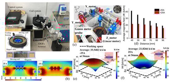 Control system analysis using magnetic simulation and magnetic field measurement: (a) control system configuration; (b) simulation results including M3 at 25 and −25 A; (c) developed three-axis measurement system and LabView-based instrumentation software; (d) measured average magnetic field strength with −25 and 25 A driving currents according to changes in height up to 96 mm; (e,f) field distributions for −25 and 25 A, respectively, at 56 mm height: He and Hm are the magnetic fields of the electromagnets and M3 (permanent magnets), respectively. (see Video S2).