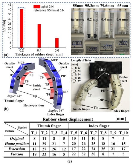 Basic properties of the rubber sheet: (a) displacements of the rubber sheet according to the sheet thickness at the applied force of 2 N. (b) Robotic finger structure and configuration. (c) Fabricated robotic finger: length of thin rubber pad and displacements at each posture (condition).