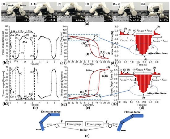 Figure 5b,c show variations in finger motion according to changes in time and driving current, respectively. In particular, the cause of these variations during the pinch motion can be confirmed through force variations observed in Figure 5d. Figure 5b,d show variations in the angles of the thumb and index and in force according to changes in time, respectively. Since the thumb and index finger are moving in opposite directions, the movement direction is reversed at the same time for both fingers. As a result of the opposite movement direction of the two fingers, the thumb and index finger angles are indicated as minus and plus, respectively, as shown in Figure 5(b1,c1) (index finger) and Figure 5(b2,c2) (thumb finger). Although the movement starts at 0 A (1), the repetitive pinch movement repeats in two sections between 25 and −25 A ((3) to (6): flexion) and –25 and 25 A ((6), (8), and (3): extension). In Figure 5, the section from (3) to (4) slowly generates a flexion motion (index finger: 43.5° to 59.75° and thumb finger: 4° to –8.75°) because the force does not work concurrently with the magnet array (M3); whereas in the section from (4) to (5), the flexion motion proceeds rapidly by the magnetic coupling force between the device magnets (M1 and M2) and the magnet array (M3) (index finger: 59.75° to 99.5°; thumb finger: –8.75° to –75°).