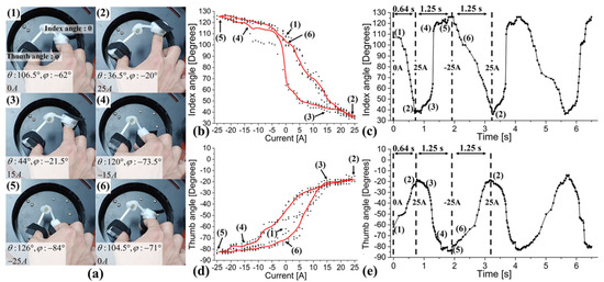 (a) Thumb and index finger postures during pinch motions using the proposed mechanism. (b) Index finger angle variations according to changes in time. (c) Hysteresis property of the index finger: index finger angle variations according to changes in the driving current. (d) Thumb angle variations according to changes in time. (e) Hysteresis property of the thumb: thumb angle variations according to changes in the driving current.