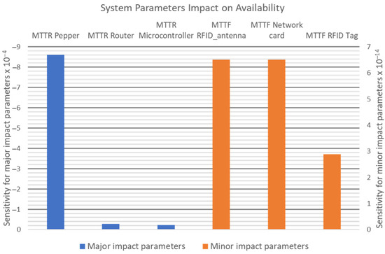 Such a setup was proposed in [22], where besides the Pepper robot, a setup was added comprising a microcontroller and RFID reader. Following the analysis of the setup through reliability block diagrams (RBDs), the components that had the greatest impact on the availability of the object-identification system were identified. Figure 2 shows the parameters (i.e., mean time to failure (MTTF) and mean time to repair (MTTR)) that have a major impact versus ones with minor impact on system availability.