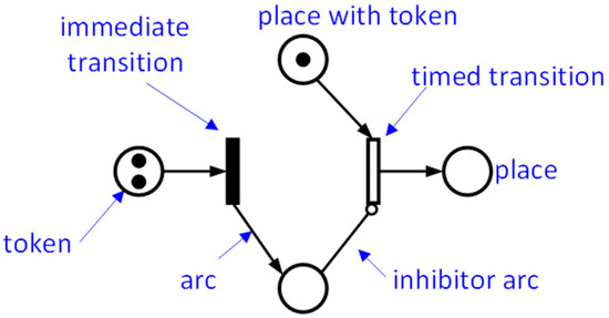 Determining the availability of a system, including the relationships between operating conditions and events occurring during operation, it is necessary to use Petri nodes. Initially, the analytical model based on Petri nodes does not contain the time component, but it is added later, with it becoming an SPN. By performing the analysis, it is possible to model the state of the components that comprise the system, so that the state of the system derives from the state of its components, which are no longer explicitly expressed [23]. A system is described through the SPN using symbols that describe the events, transitions, and states of the system (Figure 3). As the SPN model takes into account the events during the RFID anticollision algorithm, it allows for an improved estimation of the time (i.e., as number of inquire frames) needed to identify the RFID tags. In this paper, the SPN is used to model the availability of an RFID system (RFID tags, antenna, and reader, and robot software component responsible with managing the information), and to find the optimal number of tags that could be identified through the smallest number of inquiry frames.