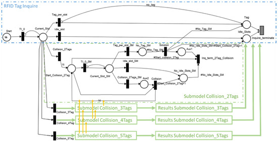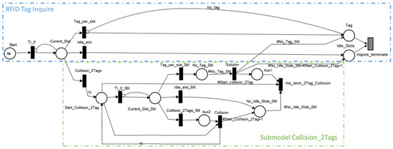 A submodel implementation relays on the values provided by Equations (2)–(4). Each submodel has places that monitor the number of identified tags (i.e., one tag per slot), idle slots, or the types of collisions that occurred. In the end, each triggered submodel populates Tag with the number of identified tags (Figure 7).