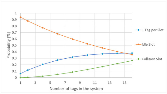 As the inquiry frame has L = 16 slots, the probability that a RFID tag selects a slot is equal to [18,20]. The probability that a slot is selected by multiple RFID tags is described through the following binomial distribution [18,28]: