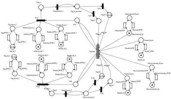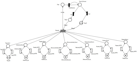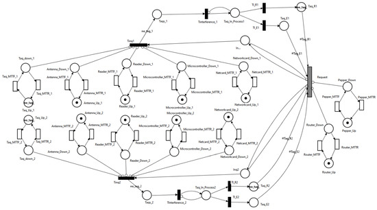Equations (2)–(4) are used in describing the RFID tag identification through an SPN model. The SPN model from Figure 7 was implemented in the Mercury tool and comprises the following components: