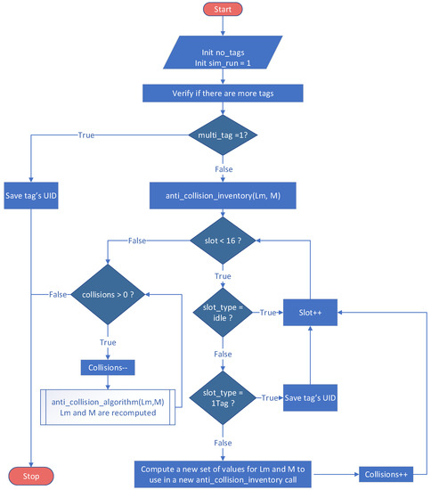 The implemented anticollision algorithm is specified in the ISO15693 standard [17]. According to the standard, when a collision is detected because of several tags near a reader, a mask value (M), mask length (Lm), and number of slots (L = 16 slots) are transmitted during the inventory command.