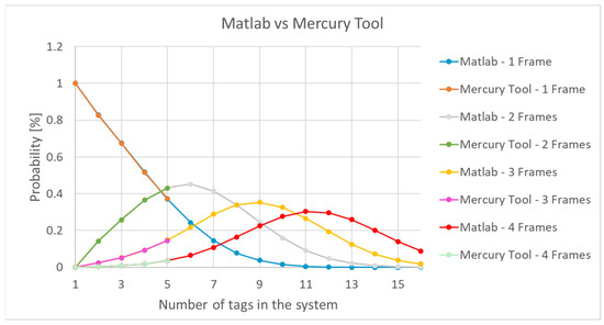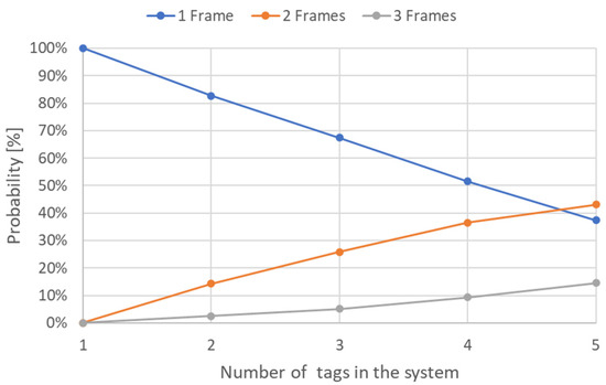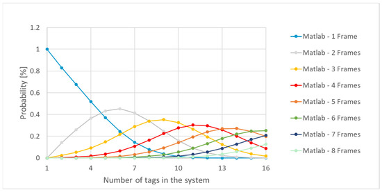 Analyzing the values in Figure 15 showed that, from a number greater than 5 tags, the probability of detecting the tags in at least two frames was higher than the probability that they would be detected by a single frame. By using the MATLAB model implementation, the impact of several tags could be observed (Figure 16).