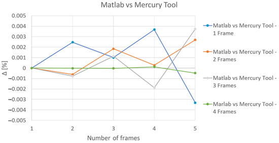 Figure 16 shows a comparison of the results with those obtained in Mercury. The deviation between the two implementations was below 0.4% (Figure 17).
