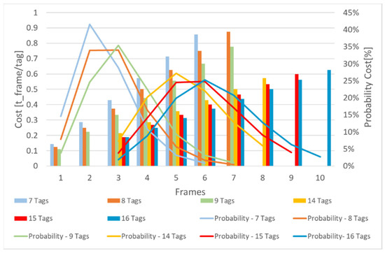If there are only eight tags in the system’s vicinity, the scenarios with the highest probabilities are those with two and three frames, characterized by a cost of and , respectively, and having an occurrence probability of 33.90% and 33.95%, respectively. In this situation, the cost is maintained in a smaller interval, which represents 67.85% of the possible situations.
