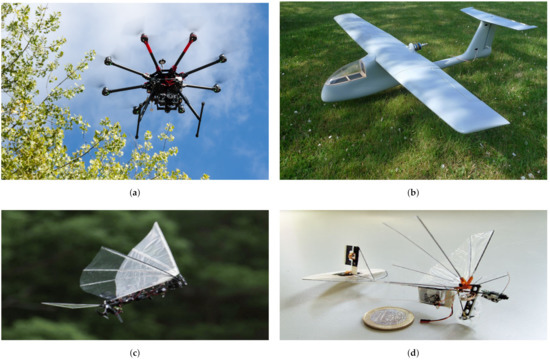 Different UAV types based on control configurations. (a) Multirotor (Hexacopter), (b) Fixed-Wing, (c) Ornithopter flapping-wing UAV (Robo Raven) [37], (d) Entomopter flapping-wing UAV (DelFly Micro).